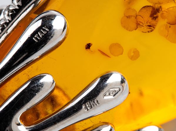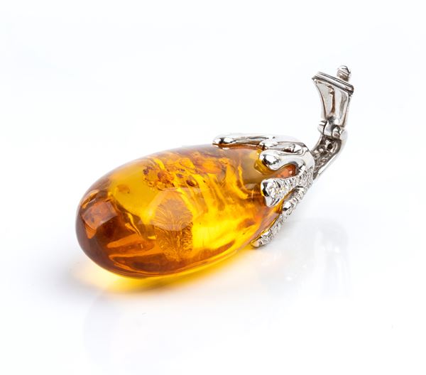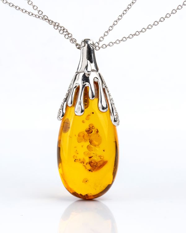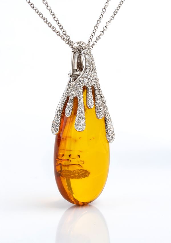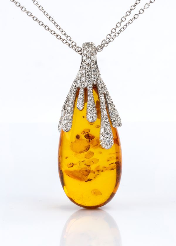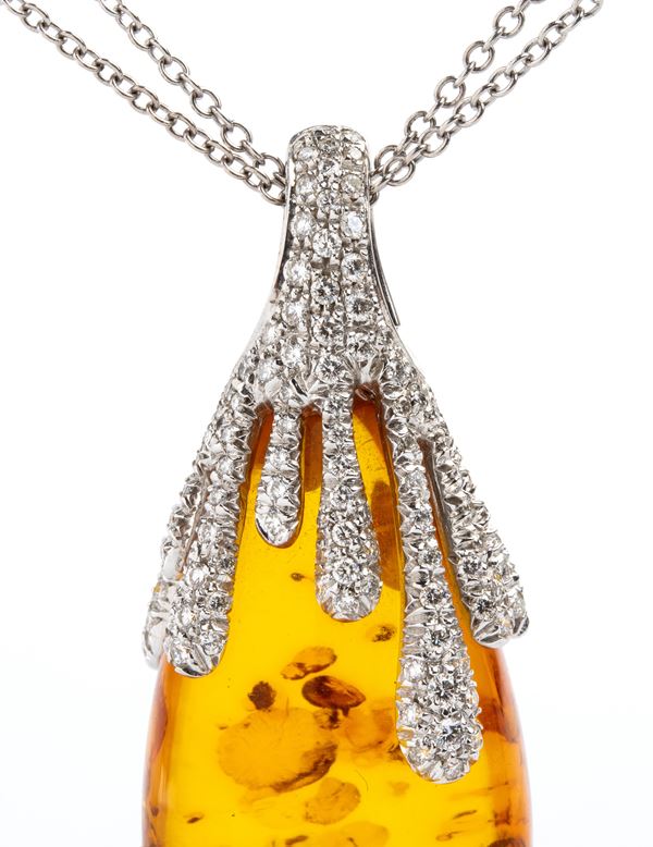 18k white gold 4 rolò chains, from wich is suspended a pendant with ambroid (treated ambra) and diamonds, round shape, brilliant cut, estimated to weigh a total of approx. 1.40 ct, G-H colour, VS-SI clarity, as gauged and graded in the mount.
