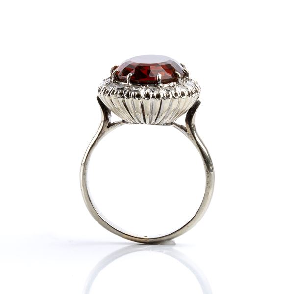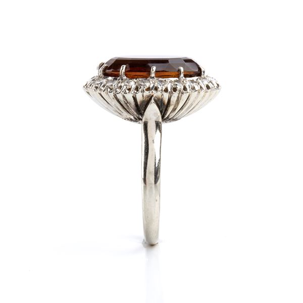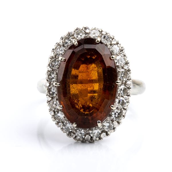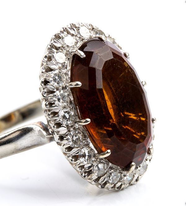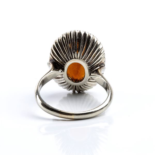 In white gold, embellished with a central oval-shaped citrine quartz and a frame of 20 round-shaped diamonds, huit-huit cut, approx. 0.80 ct, G-H, VS-SI.