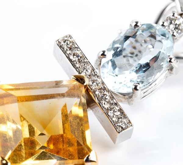 18k white gold, each with line of aquamarines and citrine quartz, round brilliant cut diamonds details, approx. 0.25 ct,G-H, VS.