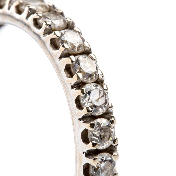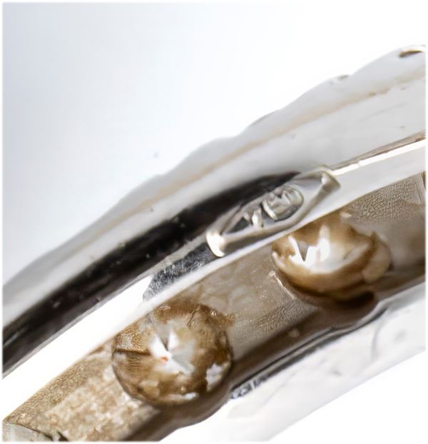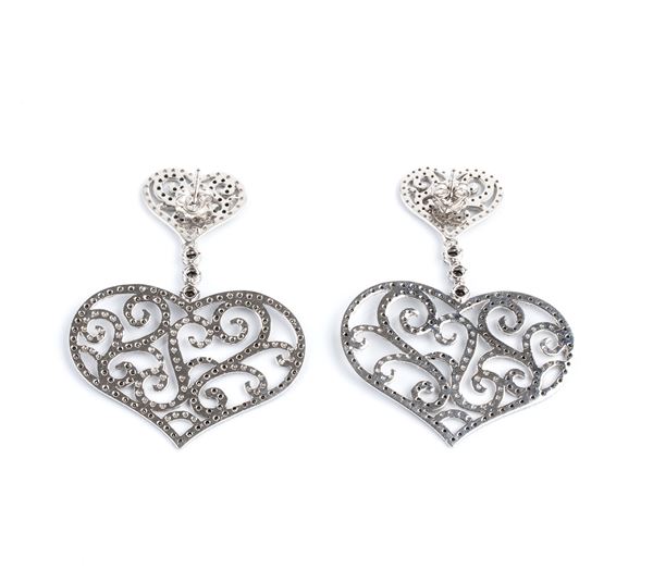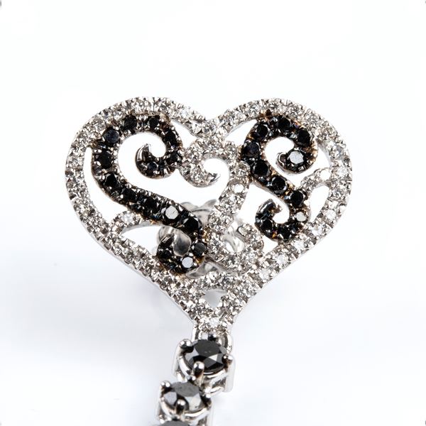 18k white gold, with moissanite ribbon scroll motif and black diamonds.