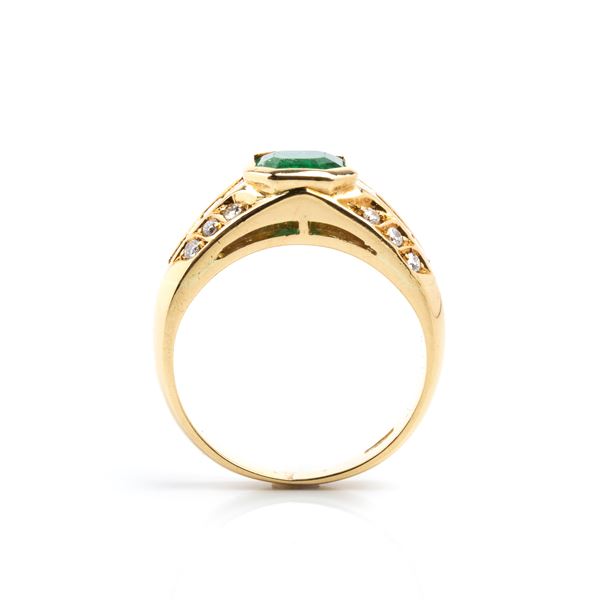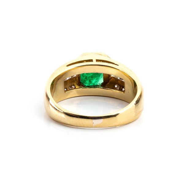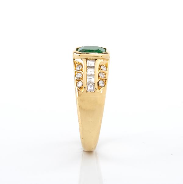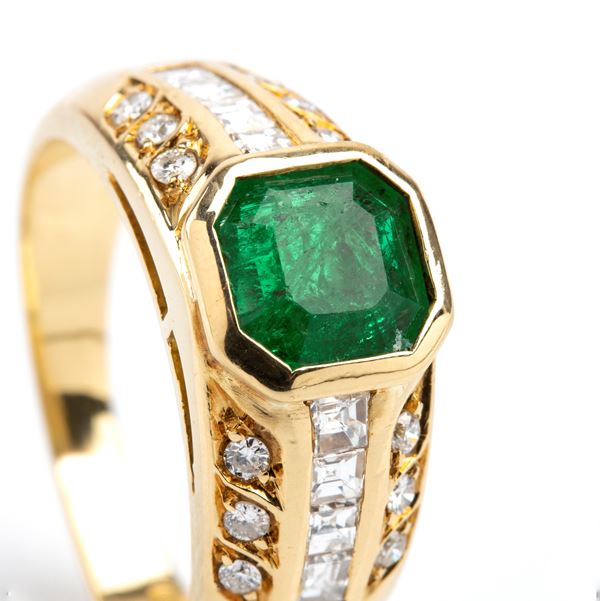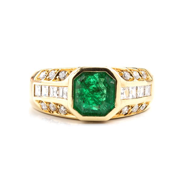 18k yellow gold, set with emerald flanked by rows of diamonds.