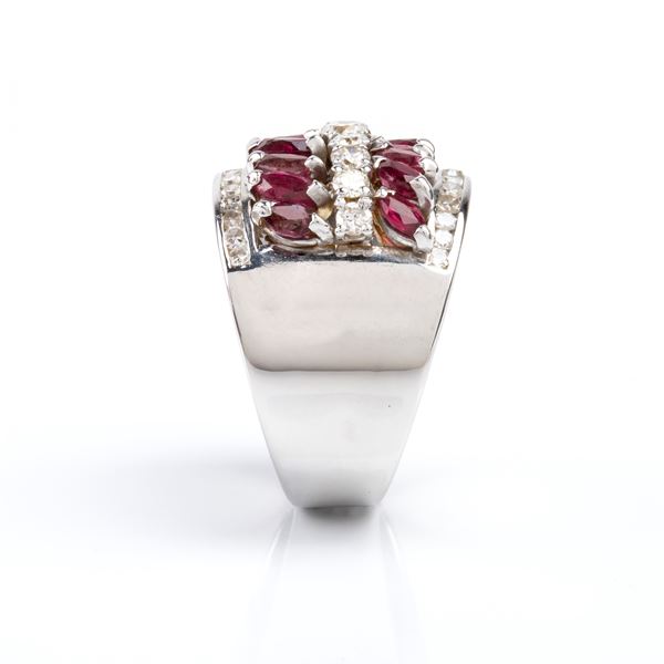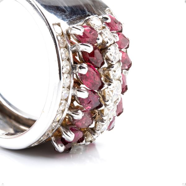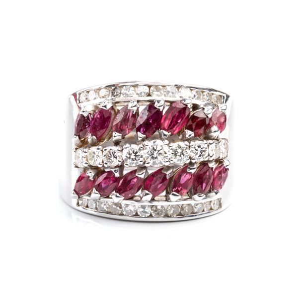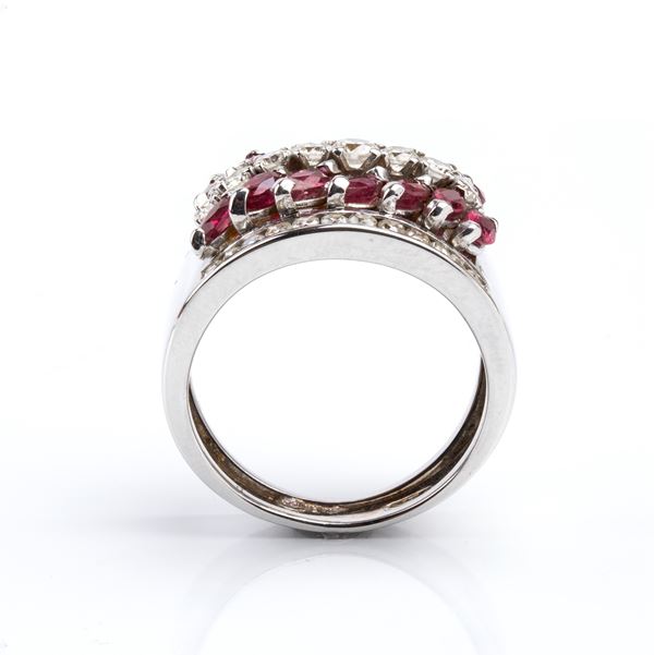 18k white gold, set with a row of diamonds profiled by two rows of rubies.