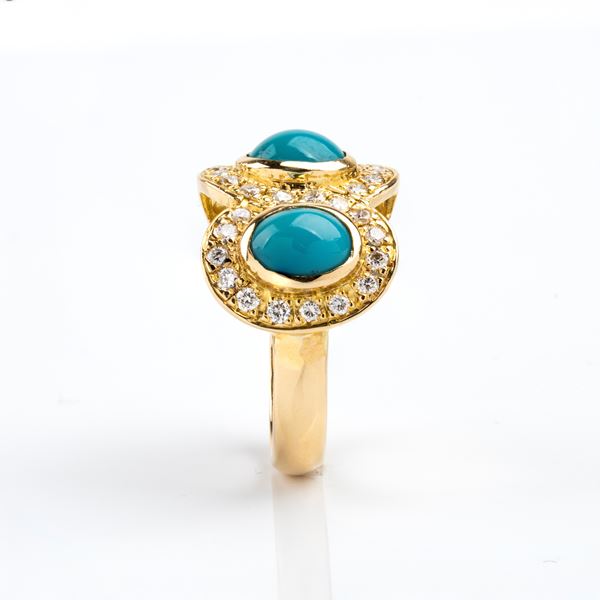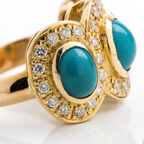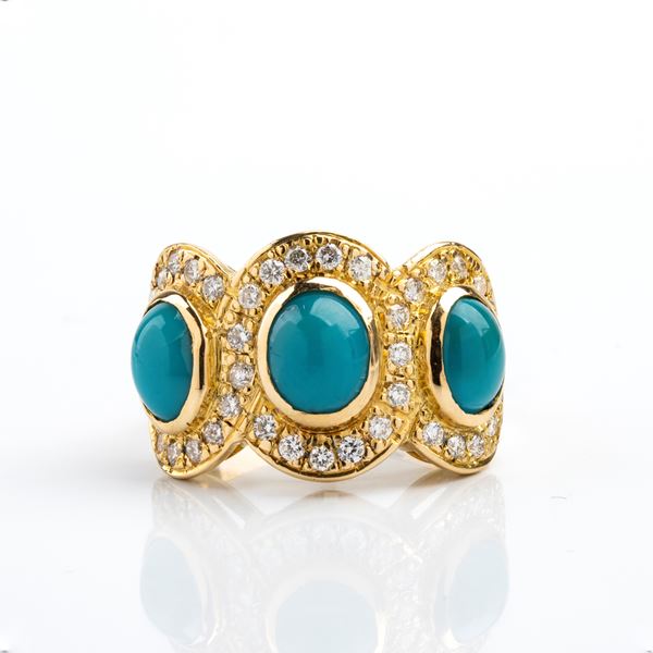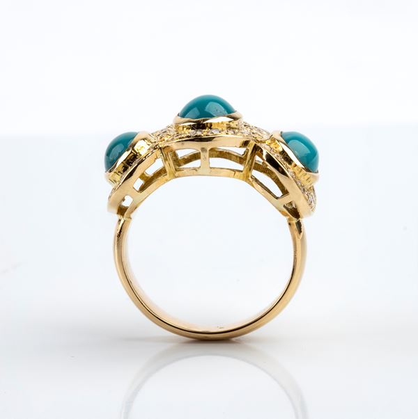18k yellow gold, with three cabochon cut turquoises between diamond ribbons.