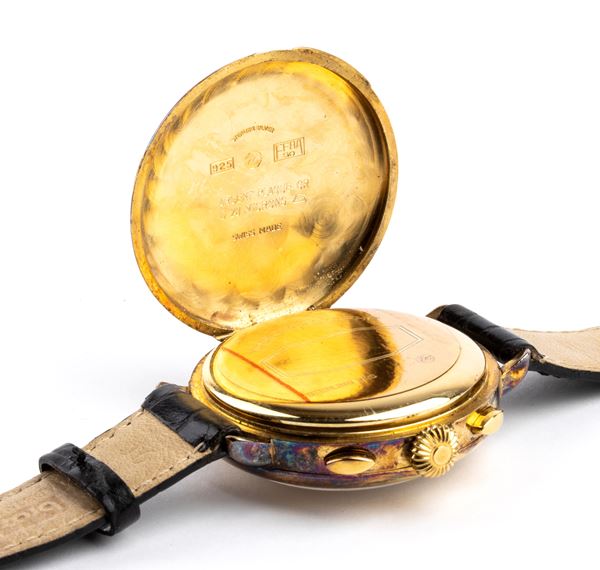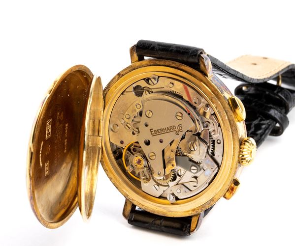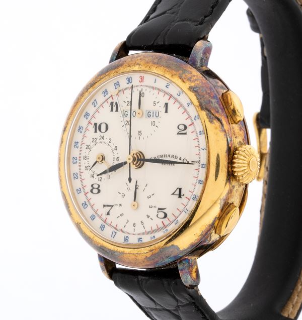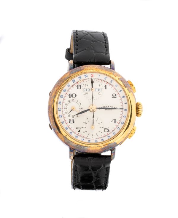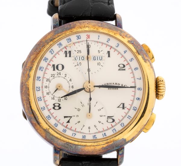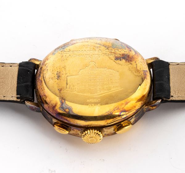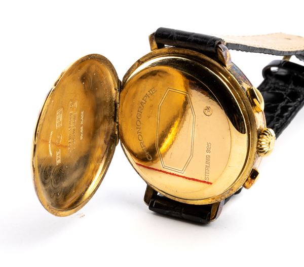 Sterling silver case plated with 20 microns of gold, white dial with three counters, calendar at 12 o'clock, Arabic numerals with black hands, blue and red chronograph scales.