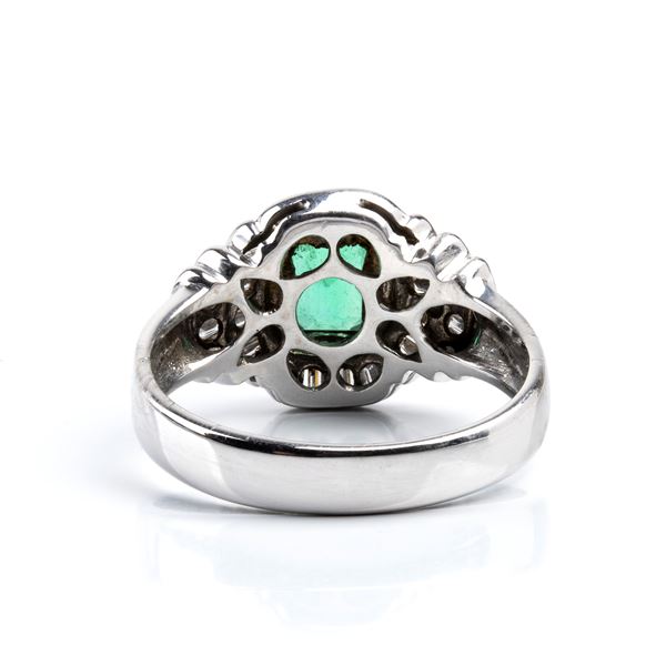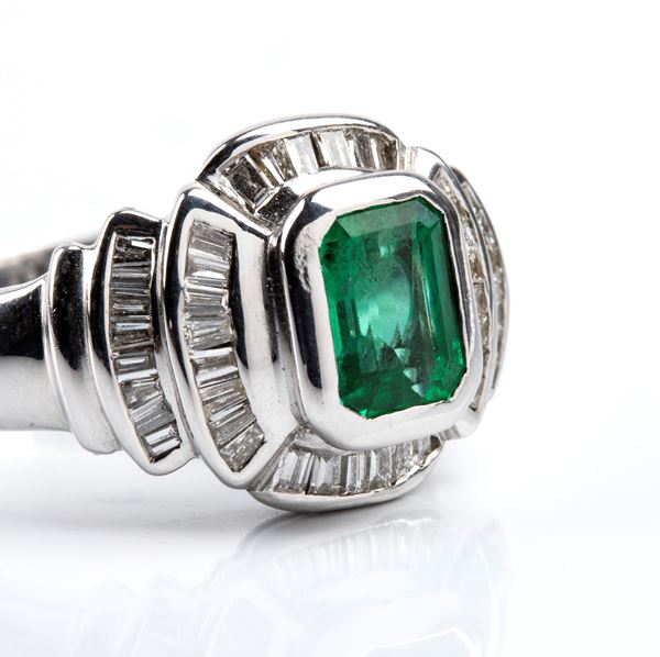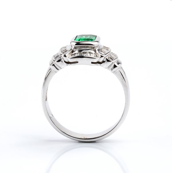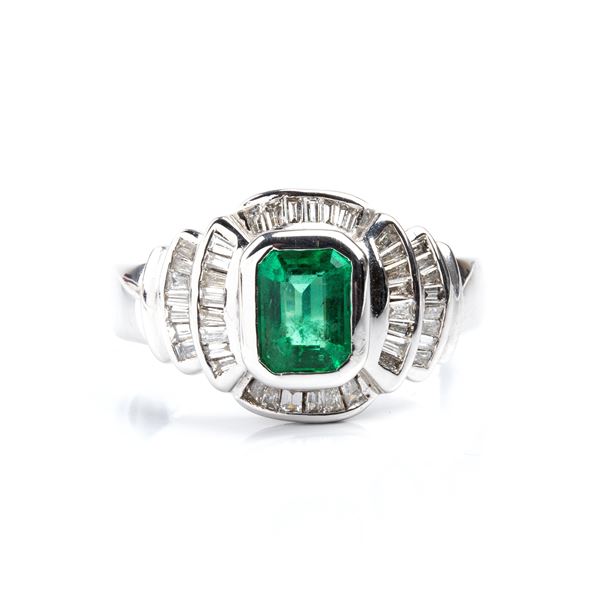 featuring an emerald-cut emerald, flanked by trapezoid-shaped diamond ribbons.