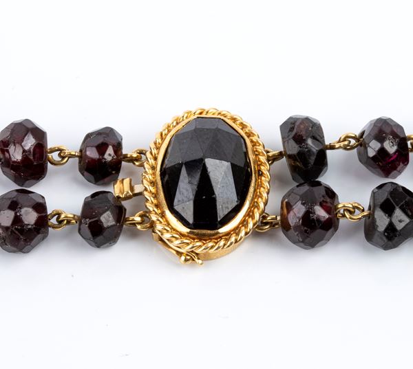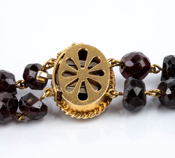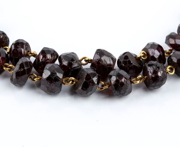 two strands of faceted garnet whashers, yellow gold firmness and mounting.