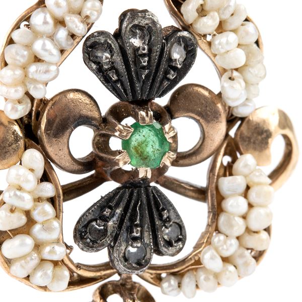 9k gold and silver with floral motifs, embellished with small pearls, emeralds and No. 06 rose-cut diamonds.