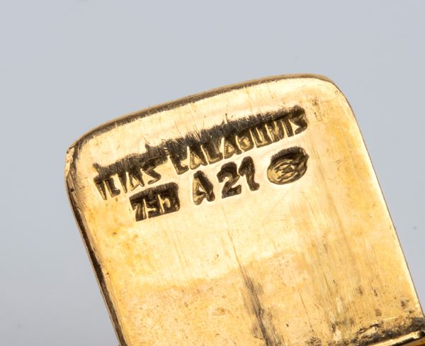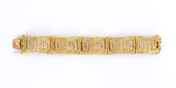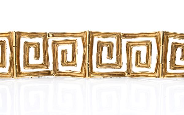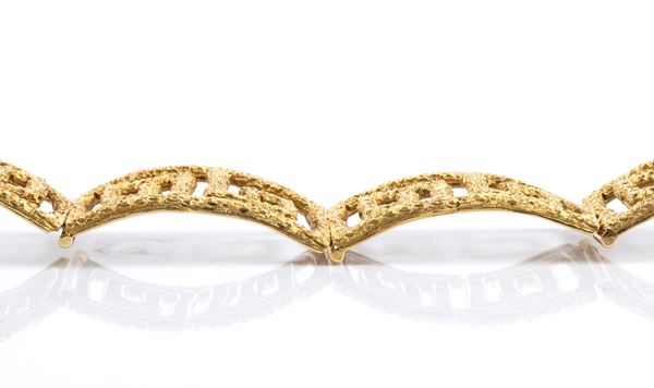 18k yellow gold, in the form of interlaced spirals with hammered texture, semi-rigid and with retractable clasp.