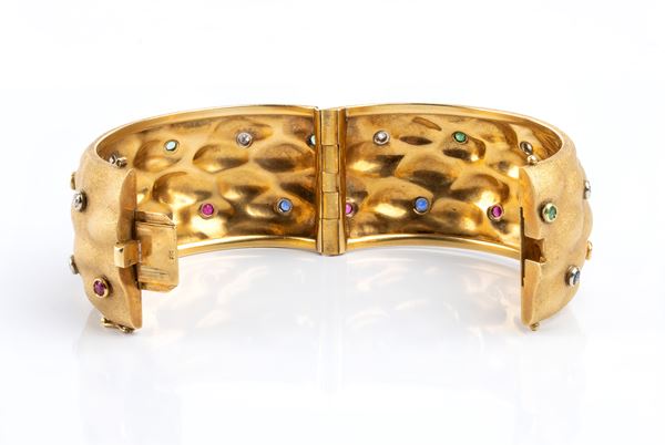 18k yellow gold, satin-finished rigid band with relief elements, embellished with a symmetrical alternation of rubies, sapphires, emeralds and diamonds.