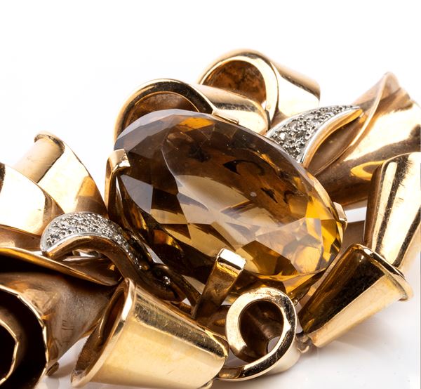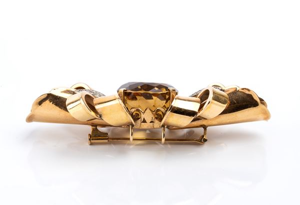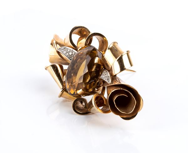 in the shape of a ribbon weave, with rose-cut diamonds and a smoky quartz in the center.