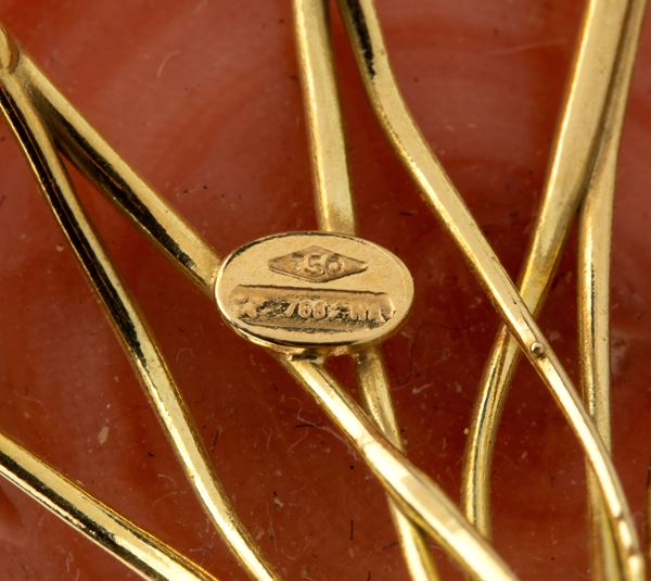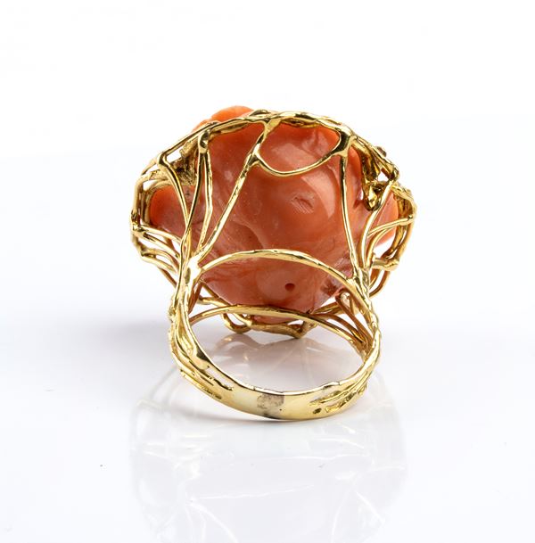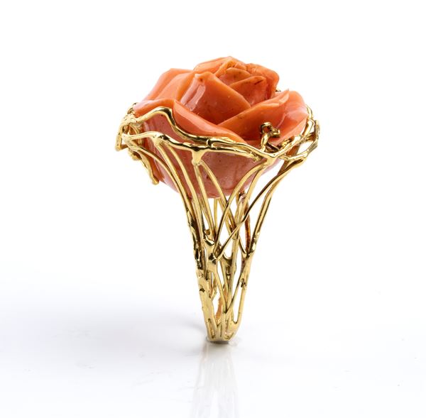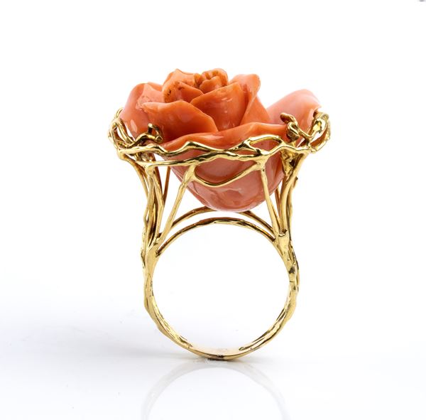 18k yellow gold mount in the shape of plant elements with a large rose-shaped Cerasuolo coral (Corallum Eliatus) in the center.