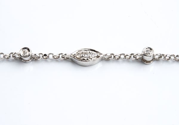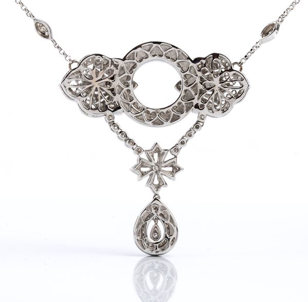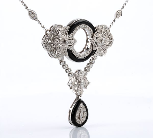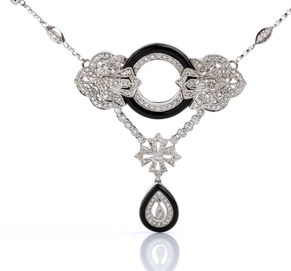 18k white gold, with chain decorated with repeated geometric elements and embellished with round brilliant-cut diamonds, also present in the pendant, placed in the centre, decorated with squared floral elements and onyx outlines, totalling approximately 1.00 ct.