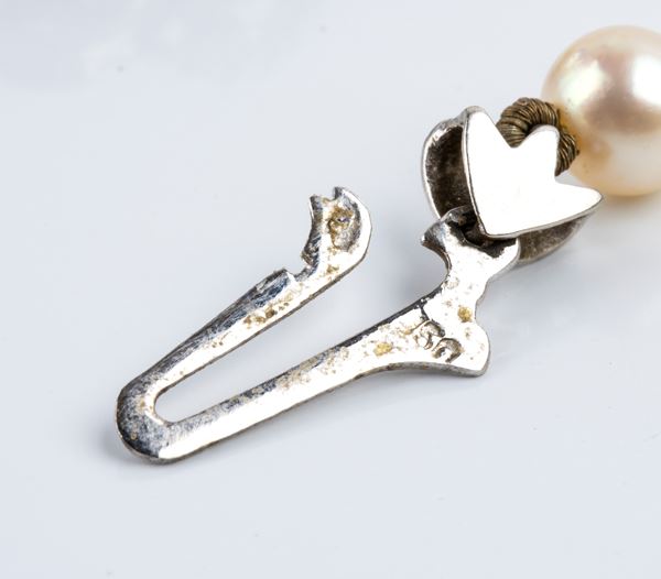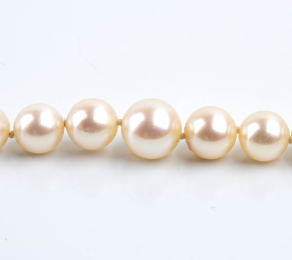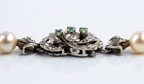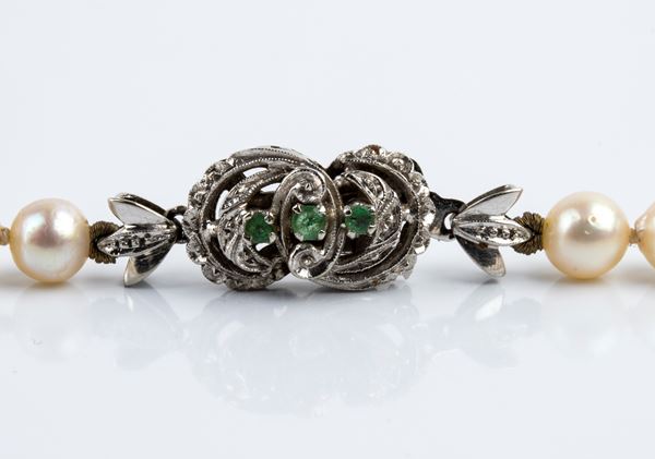 oe strand of graduated saltwater cultured pearls, plant-patterned 18k white gold firmness set with 3 emeralds.