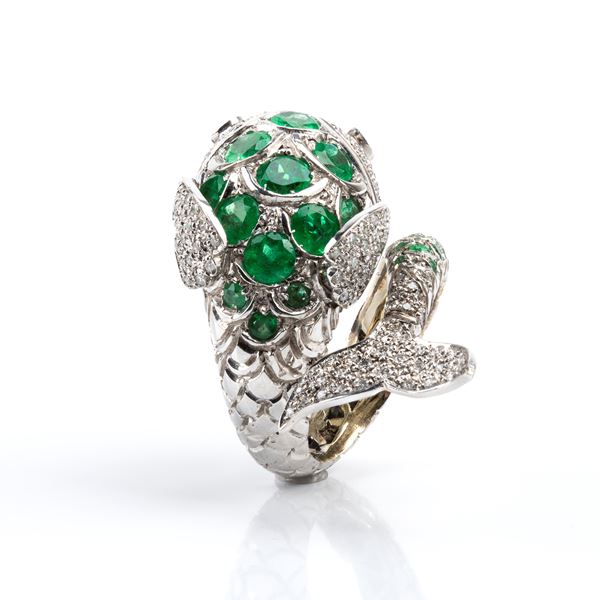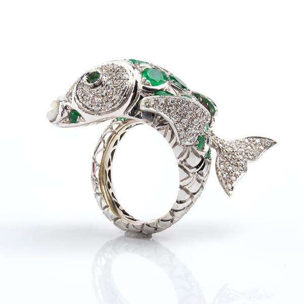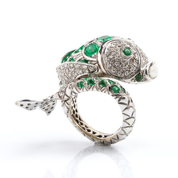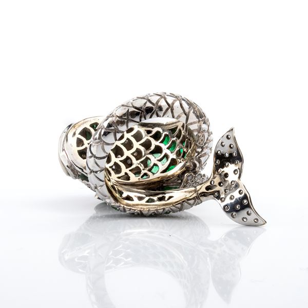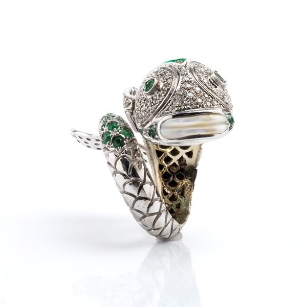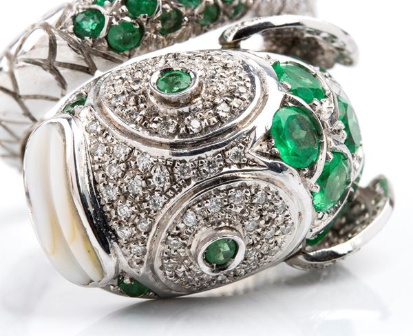 low title white gold, with pavé diamonds and emeralds, mother-of-pearl mouthpiece.