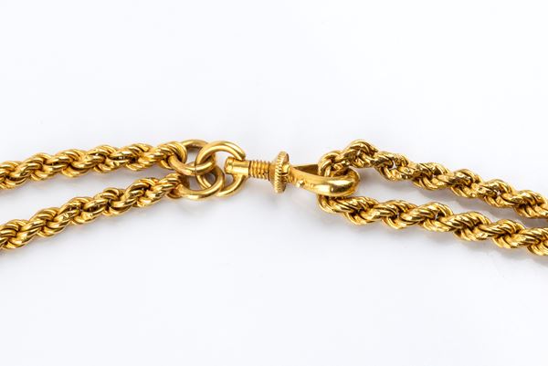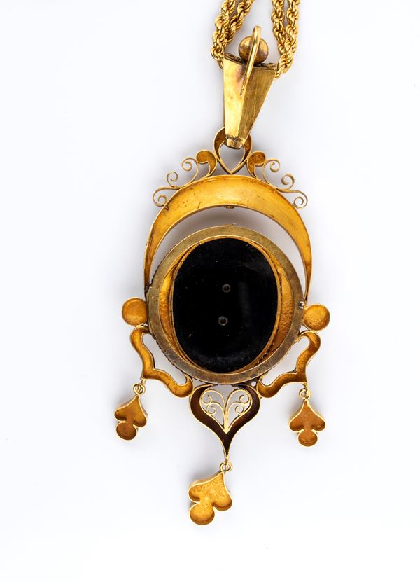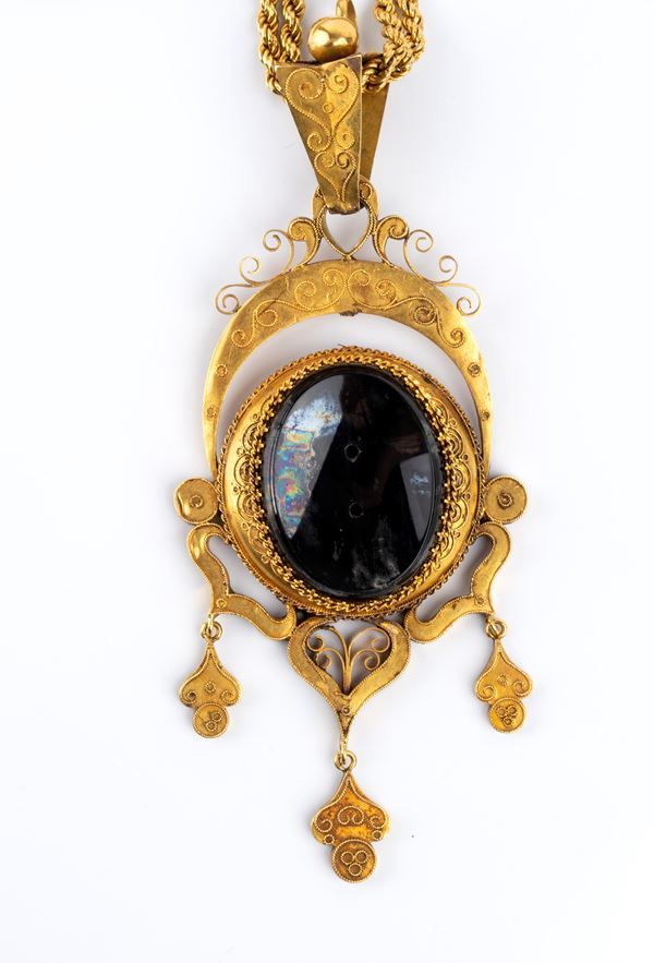 rope chain with final pendant worked with plant motifs and filigree elements, embellished with onyx in the centre concave and oval in shape, probably missing a central element.