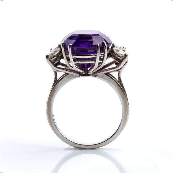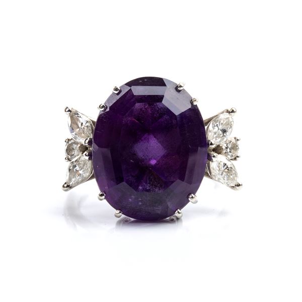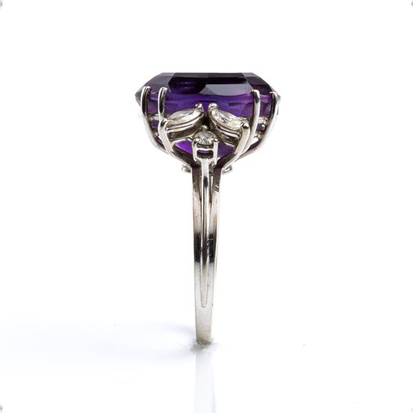In 18k white gold, embellished with a central oval-shaped amethyst and 6 round and navette-shaped diamonds, brilliant cut and modified brilliant cut, approx. 0.40 ct.