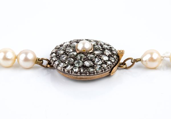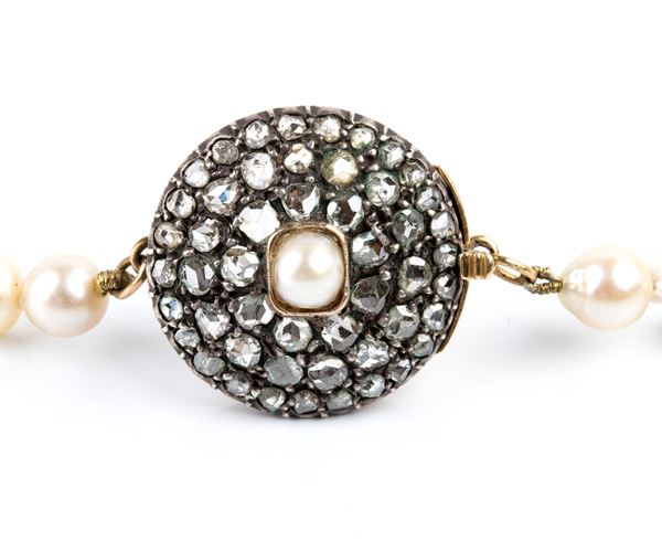 one strand of graduated saltwater cultured pearls, yellow gold and silver clasp with pave set rose cut diamonds.