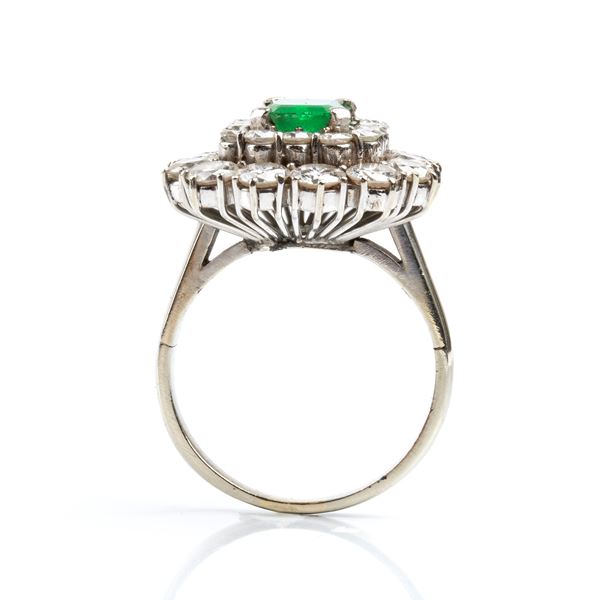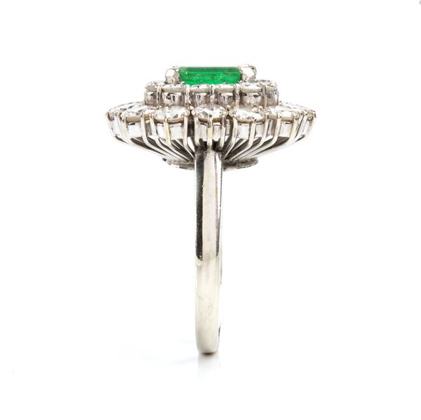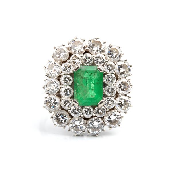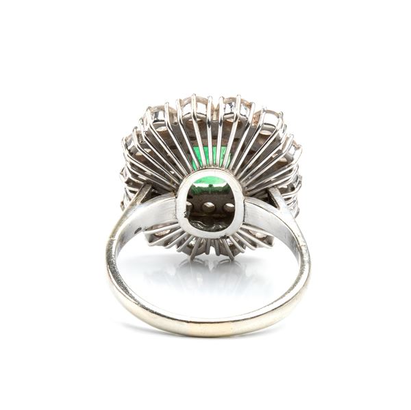 in oro bianco 18k, incastonato con smeraldo tra doppia cornice di diamanti.
