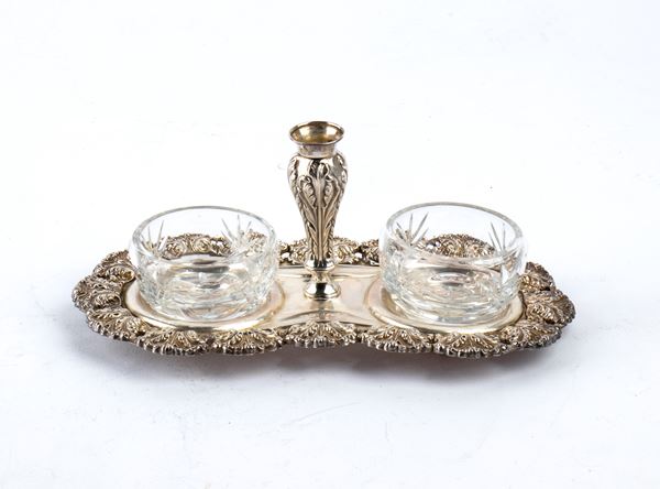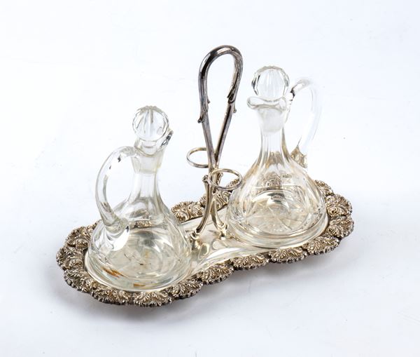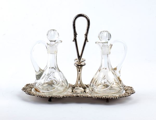 composed of: a tray with a charcuterie knife, an oil and vinegar bowl, a sugar bowl, a salt and pepper shaker, and a basket. The service is decorated on the edges with foliate motifs. It has glass elements.