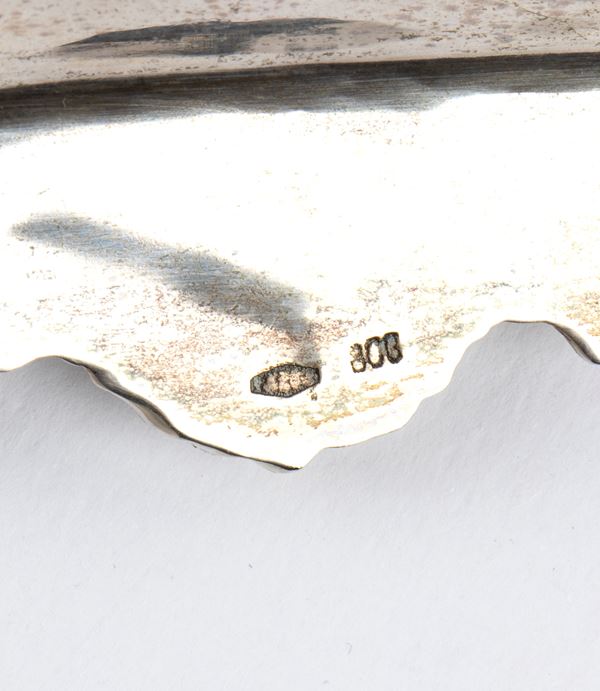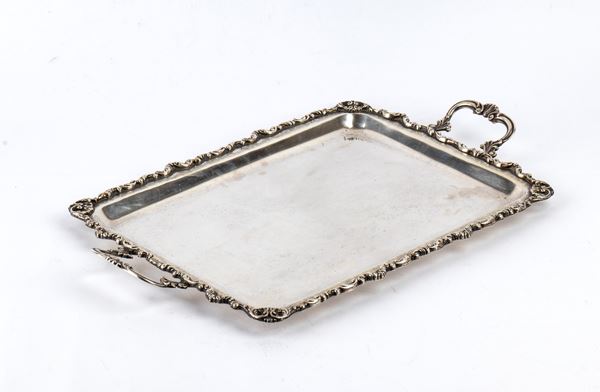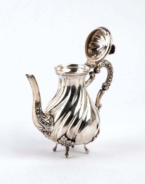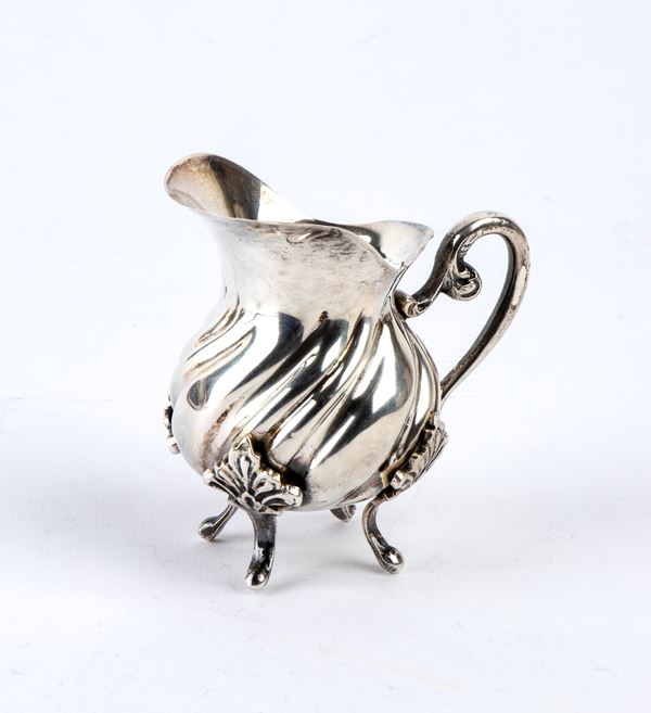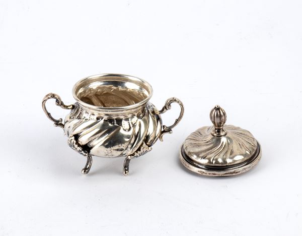composed of a tray, a sugar bowl, a teapot and a cream jug, decorated with twisted ribs, scroll and floral elements.