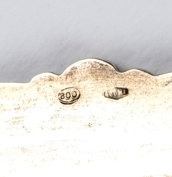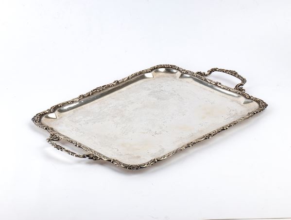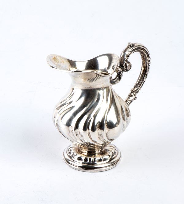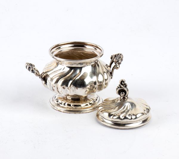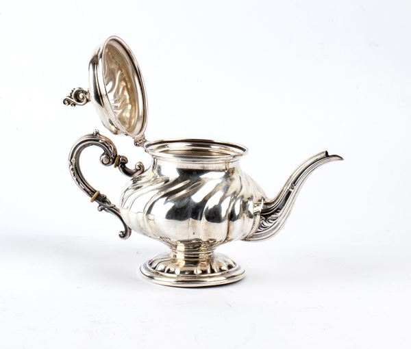 composed of a tray, a coffee pot, a sugar bowl, and a milk jug, decorated with twisted ribs and scroll motifs. The coffeepot has bone spacers.