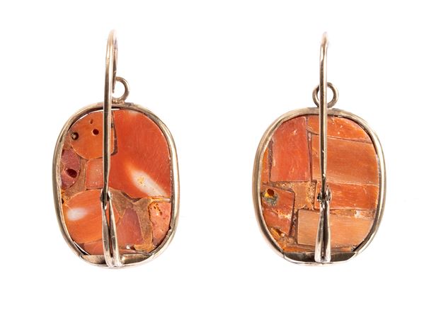 low fineness gold setting with two central cameos in Mediterranean coral (Corallium Rubrum) depicting two male's profiles.