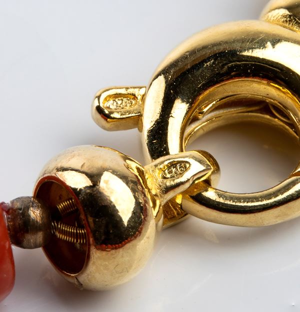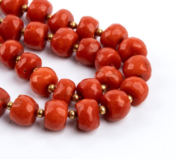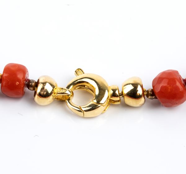 one strand of Mediterranean coral (Corallium ubrum) faceted beads, gilded silver spacers and clasp.