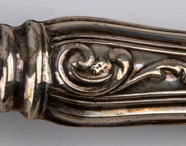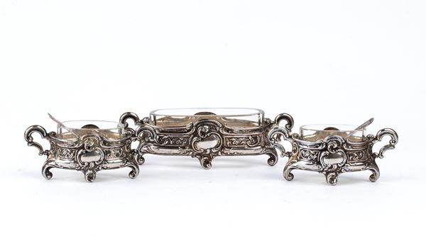 in silver, composed of: three small bowls, two spoons and two serving forks. The objects feature a foliate and floral volute decoration. The bowls of the spoons and the heads of the forks are made of honey-coloured horn; the bowls have glass elements.