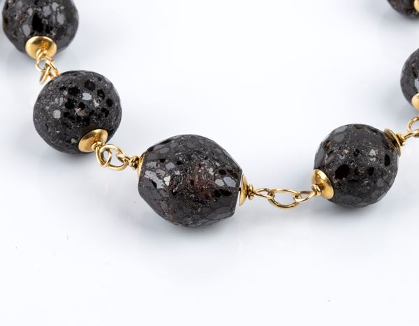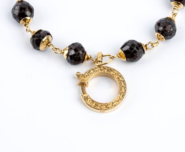 each composed of a string of faceted garnet washers, clasps and spacers in yellow gold.