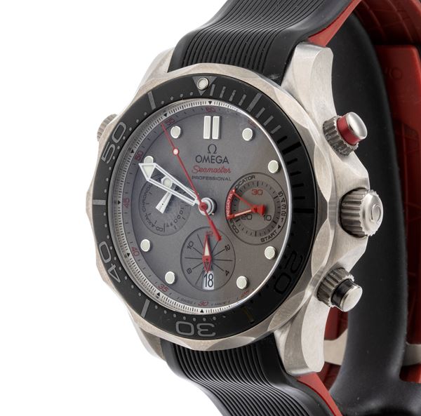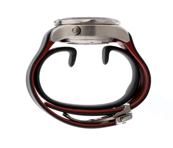 Steel case with screw-down case back, ceramic bezel, pump chronograph pushers and screw-down winding crown plus valve crown at 10 o'clock. Gray dial with white indexes and some red hands. Self-winding mechanical chronograph movement. Serial 86632491.