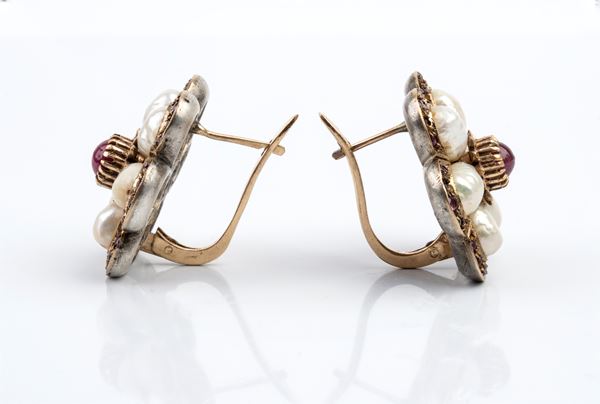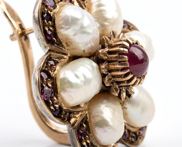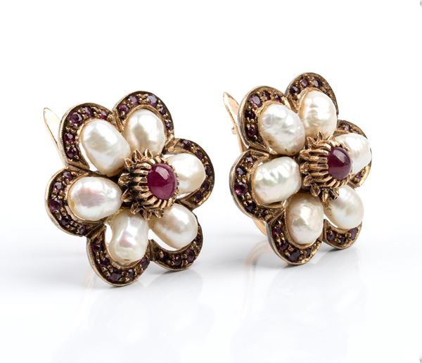 Pearl and rubies floer shaped earrings