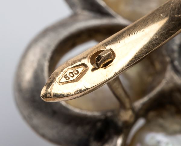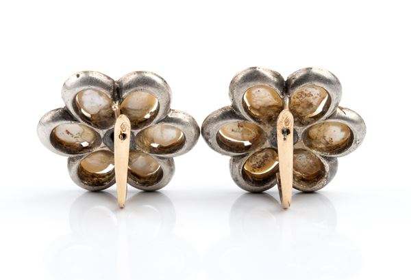 low-title yellow gold and silver setting in the shape of a flower, freshwater petals, ruby details.