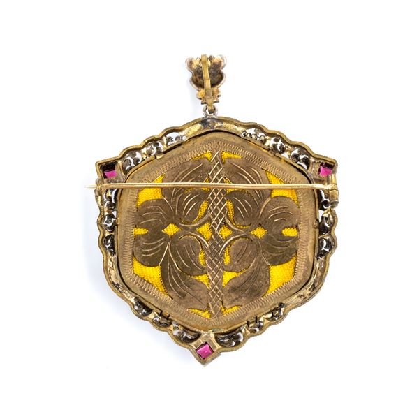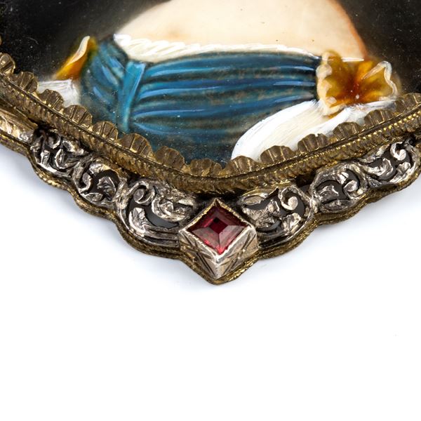 copper and silver frame in the form of a small portrait frame, worked with floral elements and embellished with 3 rubies. In the centre is painted the half-length portrait of a noblewoman.