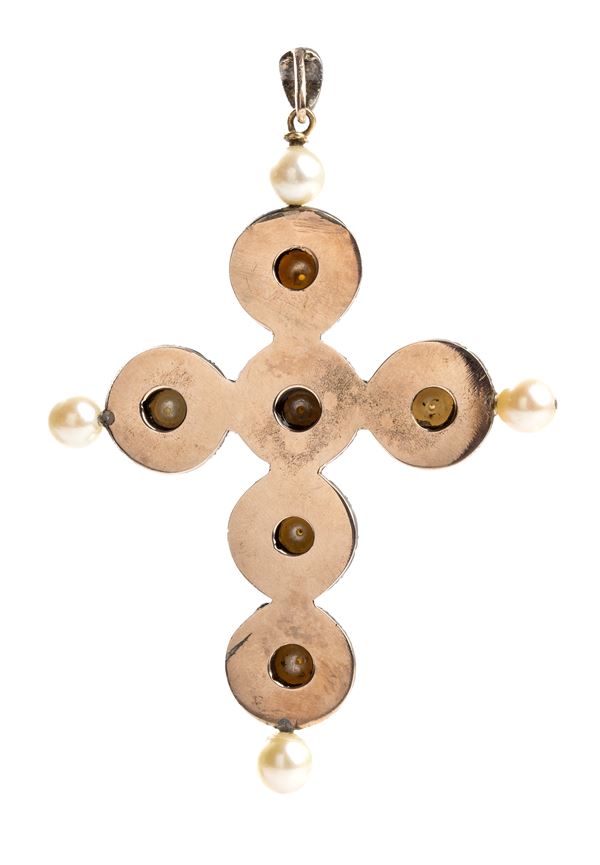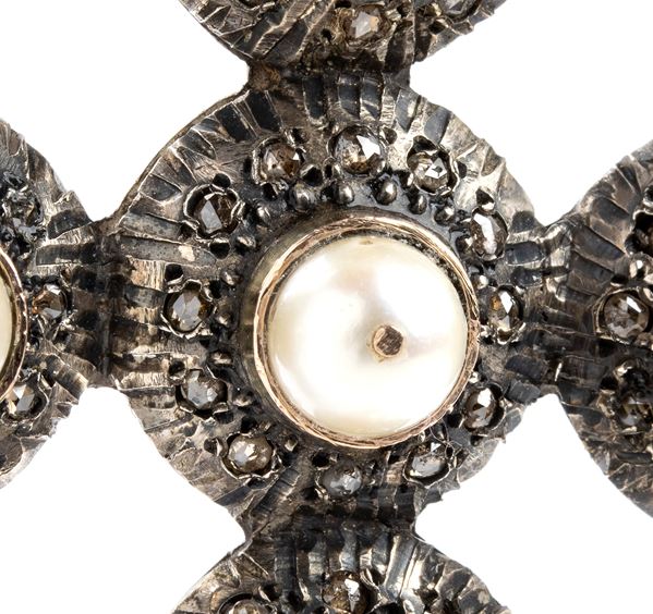 Yellow gold and silver setting, round bezels with saltwater cultured pearl and pave det diamonds.