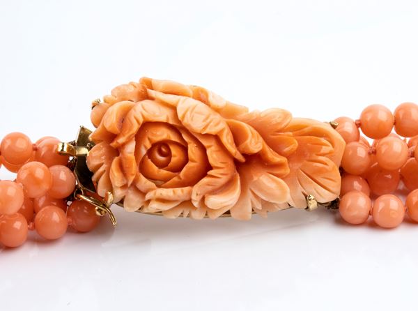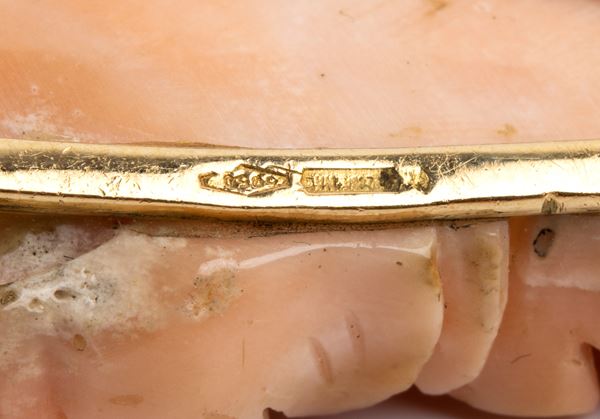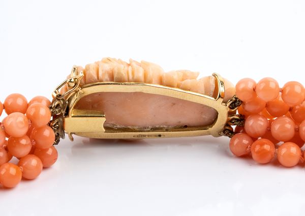 six strands of pink shell beads with 18k yellow gold firmness set set with a carved shell depicting a flower.
