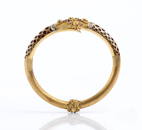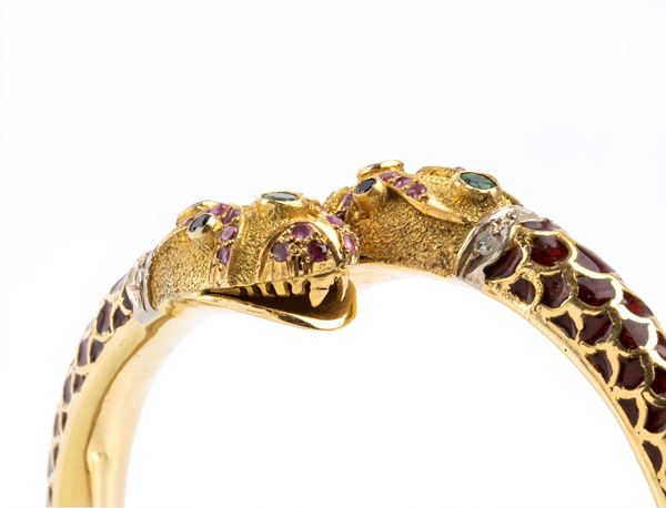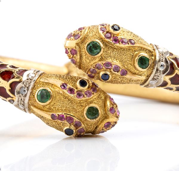Rigid gold bracelet with enamels, diamonds, rubies, emeralds and sapphires, Anni '60