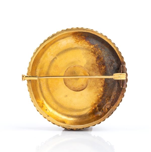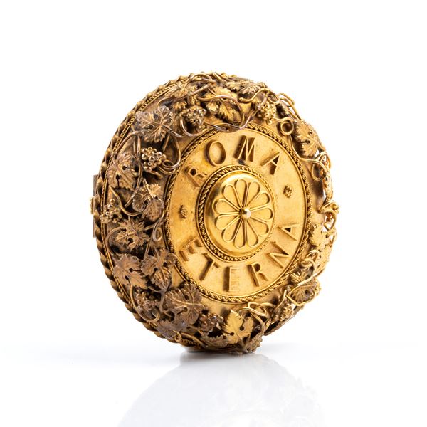 made of yellow gold, features details and decorations typical of the mid-19th century period, with influences from the return of Etruscan art, visible in the three-dimensional relief motif with cordonetto and granulation work on the front surface of the brooch. A domed round profile with a flower motif adds dimension to the centre. Framed by a composition of leaves, tendrils and bunches of grapes. In the centre is the inscription ROMA ETERNA.