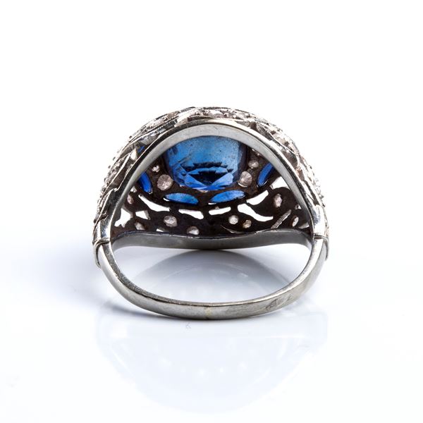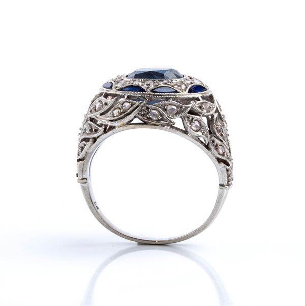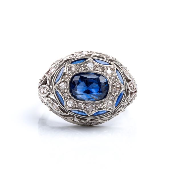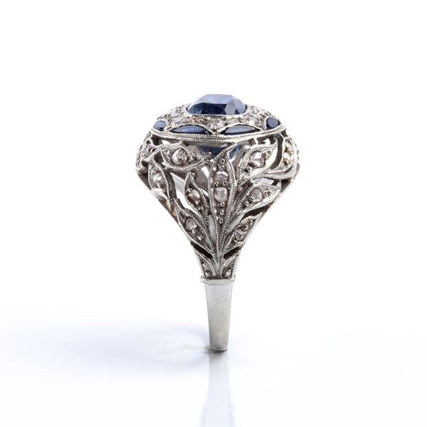 openwork floral motifs band set with huit-huit and rose-cut diamonds, centered by an oval sapphire surrounded by other sapphires in the shape of a crescent moon.