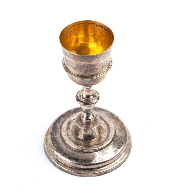 in silver made by embossing and chiselling, with a circular base, baluster stem and central knot, with an internally gilded cup, with a sober and essential line, characterised by a smooth surface and no decoration.