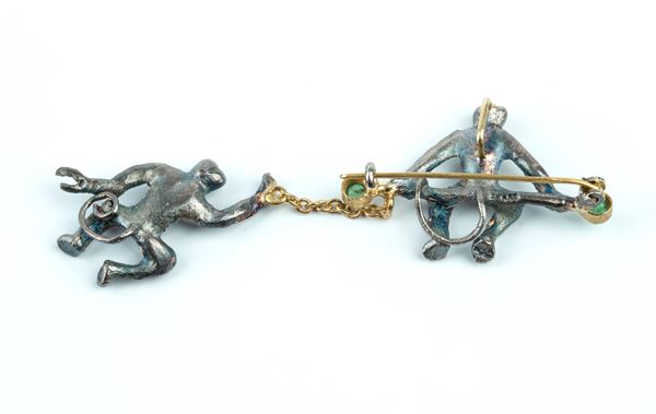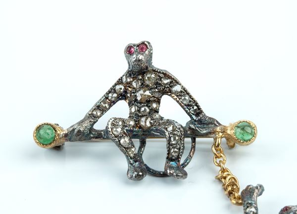 Silver, gold, diamond, emerald, ruby, Victorian inspired swinging monkey brooch, 20th century