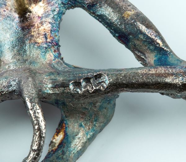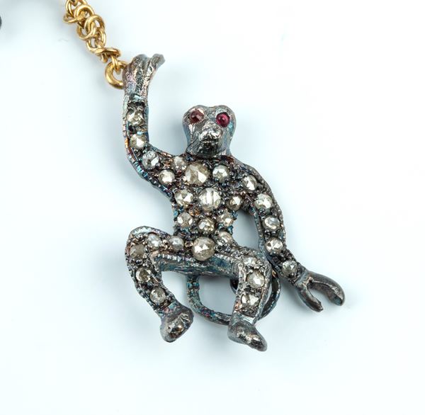 the two monkeys are embellished with pavé rose-cut diamonds. One monkey is perched on an 18k yellow bar and the other hangs from a delicate gold chain, detailed with emeralds and eyes in small rubies. This design is an example of Victorian jewellery, where whimsy met artistry.