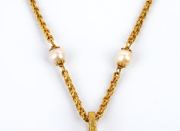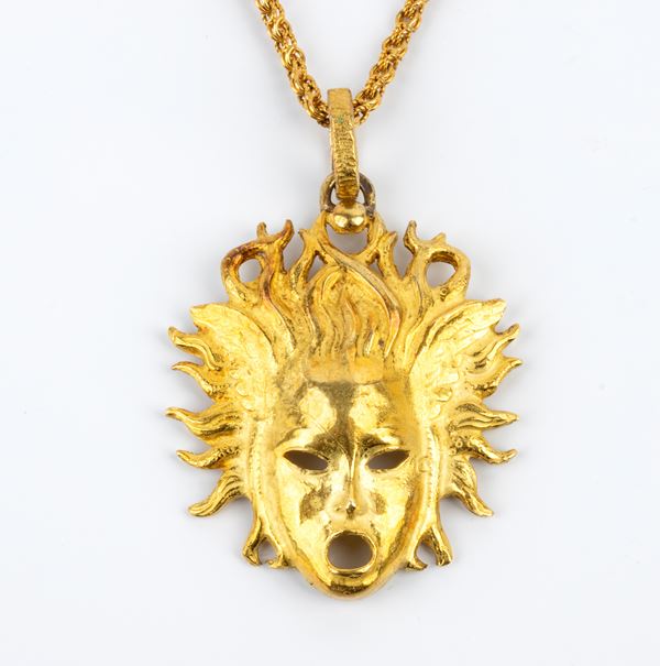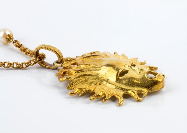 18k yellow gold, with a chain in small links rings interrupted by saltwater cultured pearls, from which is suspended a pendant depicting a female mask.