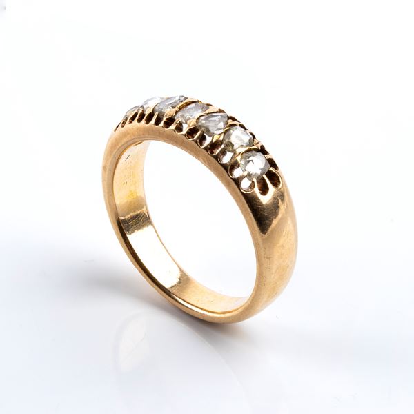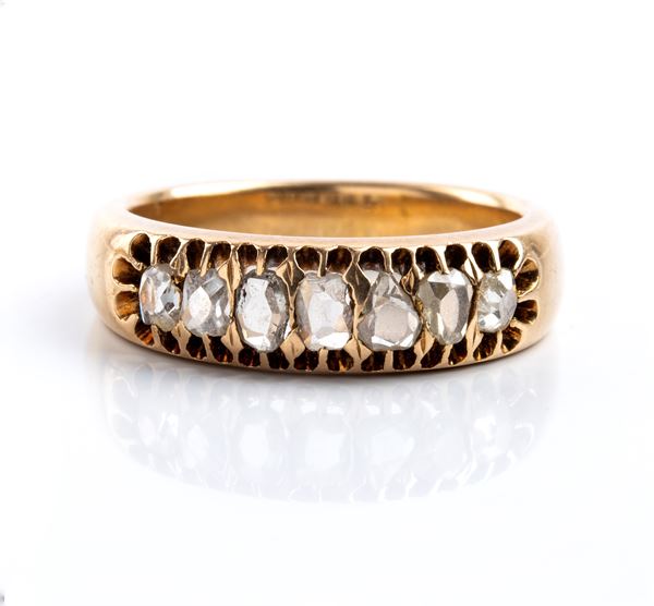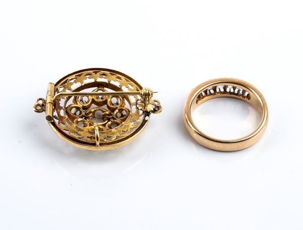 set consisting of a geometric openwork brooch and a ring, set with rose-cut diamonds.