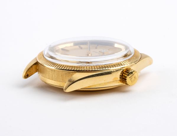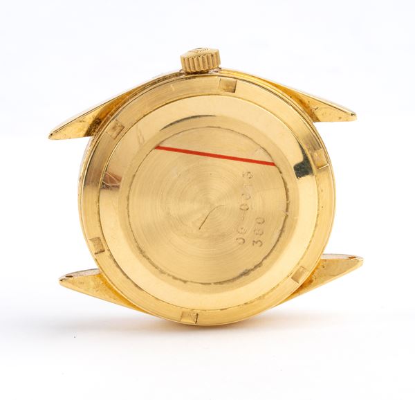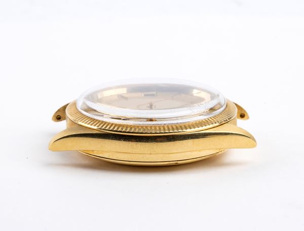 18k gold case, champagne dial with black hour markers and hands, date window at 9 a.m. Automatic movement cal 2572.