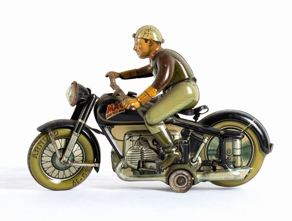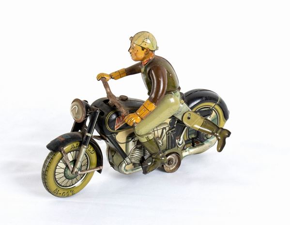 ARNOLD motorcycle model MAC700, Made in US Zone Germany, lithographed tin. Black color version. Working spring mechanism, the motorbike moves, stops and the rider simulates getting on and off the motorcycle. In good general condition