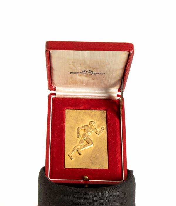White shirt of Vittorio Maggioni, Italian cross-country champion in the 1500m in 1951. Short-sleeved shirt, in wool, with "V" neckline, white, red and green outlines for the Italian champion title on the neck and sleeves. Dedication with autograph in black marker, handwritten by Maggioni, on the left chest. Together with the shirt we have the medal for participation in the 1951 Italian Men's Championships - Milan 28-29-30 September. Gilded silver medal (stamp 800) preserved in the original S.A.Picchiani & Barlacchi Firenze box. Lot in excellent condition