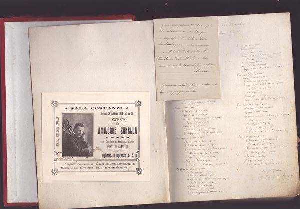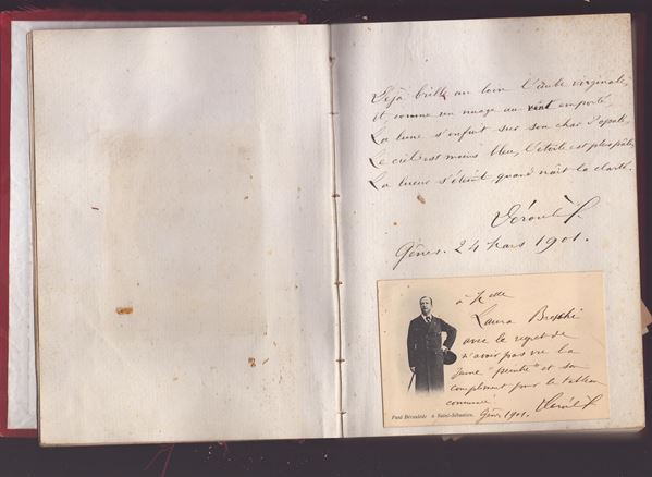 In order we find: a whole page with an autographed poetic composition by Anton Giulio Barrili dedicated to his nieces Laura and Maura; two photographic postcards with dedication and signature by Miecio (Mieczyslaw) Horszowski (pianist 1892-1993); a portrait of the young Laura in ink dedicated and signed Luigi Gallina '99 (painter 1865-1931); an autographed poetic composition and a postcard with dedication and autograph by Paul Déroulede (writer 1846-1914); a photographic postcard with dedication and signature by Cesare Pascarella (Roman painter, poet 1858-1940) and an original ink drawing of a donkey TO MY PATIENT BROTHER! also signed by Cesare Pascarella; a dedication with an autograph signature by Leopoldo Fregoli (the quick-change artist, 1867-1936); a musical line with dedication and autograph signature by Ruggero Leoncavallo (composer 1857-1919); a postcard with a musical line dedicated and autographed by Umberto Giordano (composer 1867-1948); 4-page letter/story with autograph dedication by Luigi Morandi, writer, poet and Garibaldian with Barrili (1844-1922); a poem with an autograph signature by Rosmunda Tomei Finamore (1864-1955); photographic postcard with dedication and signature of Smara (Smarande) Gheorghiu, Romanian poet and feminist movement activist (1857-1944); a sepia ink caricature of P.G.Breschi signed by GANDOLIN (Luigi Arnaldo Vassallo designer and director of Secolo XIX in Genoa); and then a small brochure signed by Amilcare Zanella, and 8 other various autographs (Ferdinando Martini, and others)