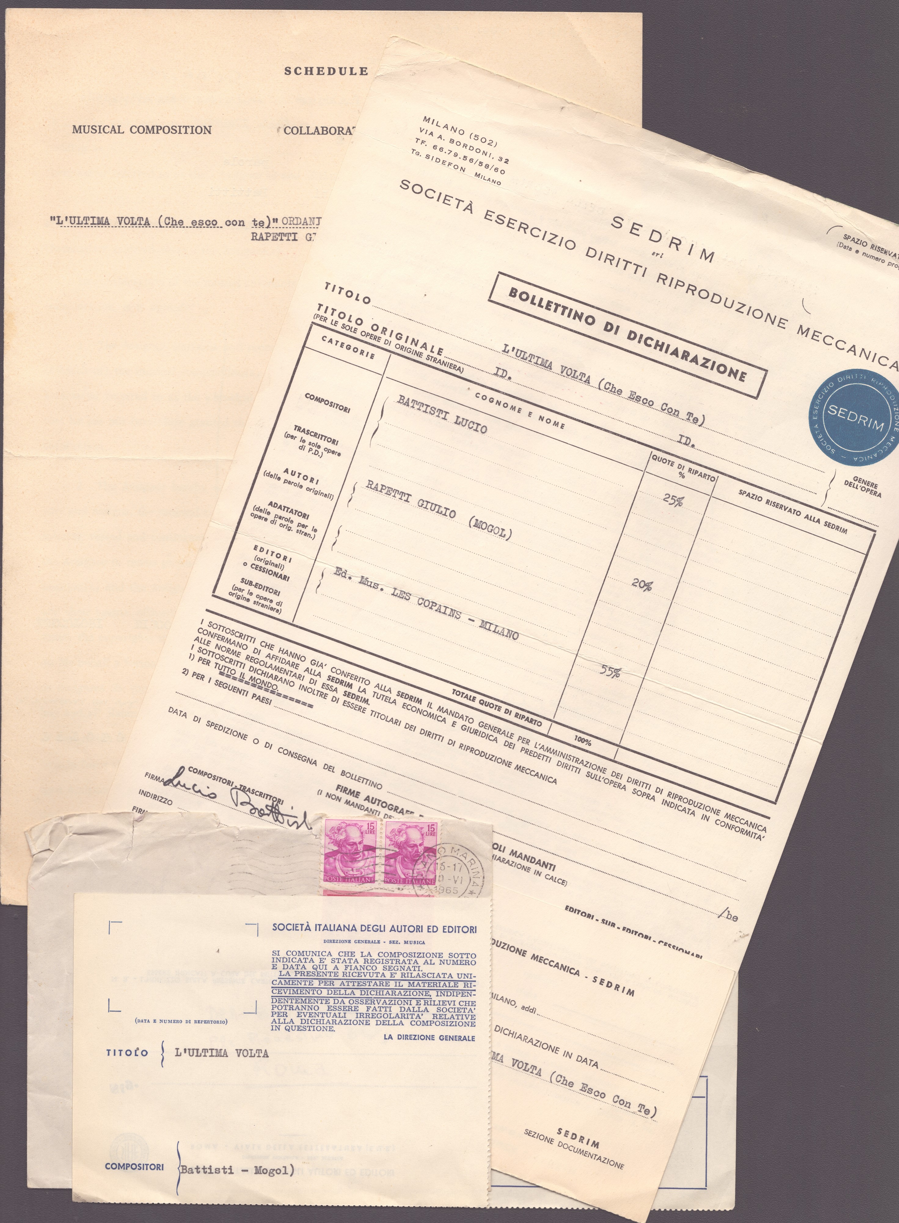 Copy of the general mandate signed between Lucio Battisti, Giulio Rapetti (lyricist Mogol), and SEDRIM Società Esercizio Diritti Riproduzione Meccanica (Mechanical Reproduction Rights Company) regarding the distribution of proceeds from the reproduction of the song titled L'ULTIMA VOLTA (Che Esco Con Te)