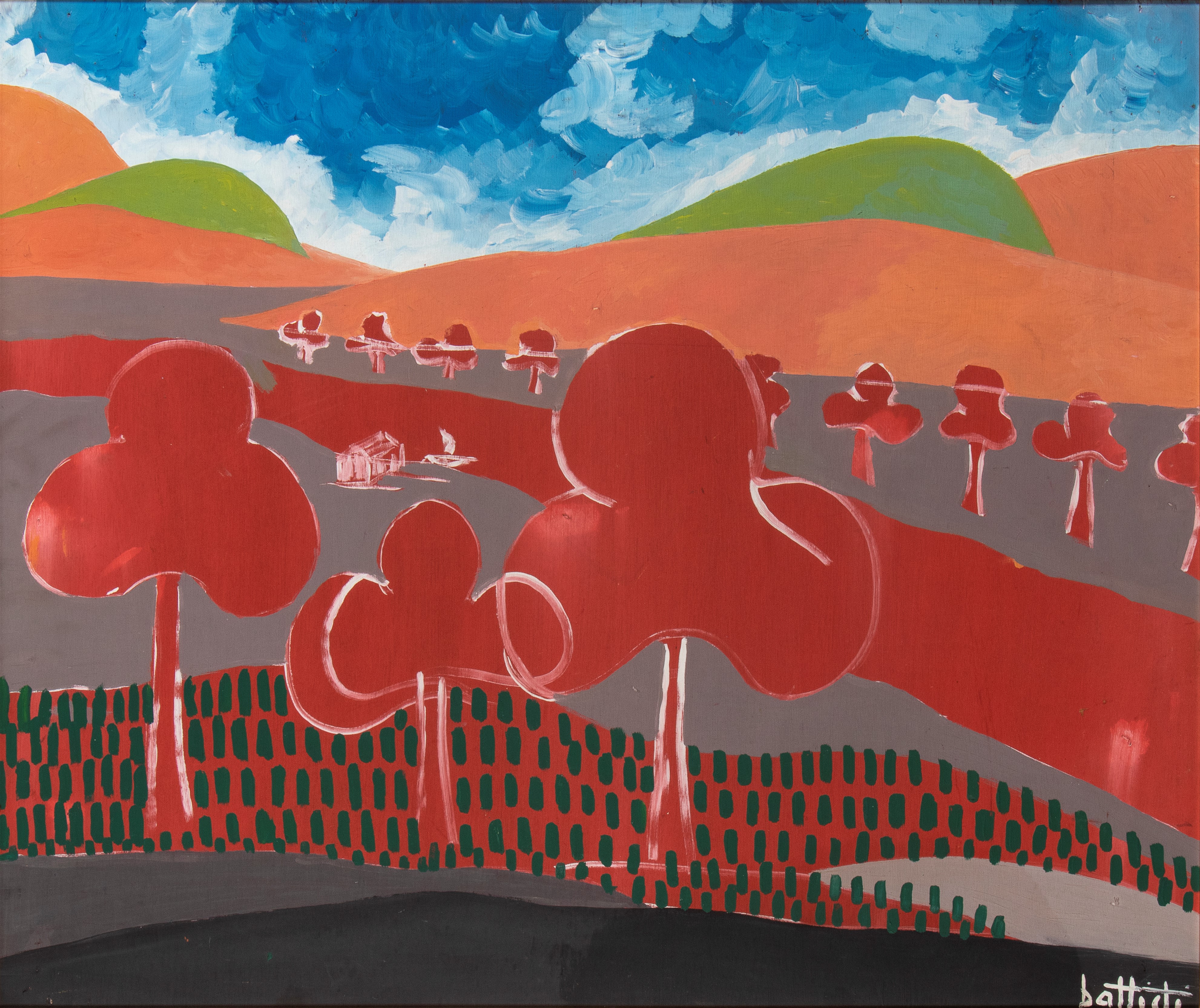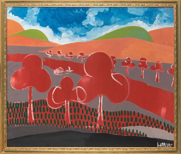 Oil on panel, 172 x 87 cm, created in 1972 by Lucio Battisti (Poggio Bustone, March 5, 1943 โ Milan, September 9, 1998) and titled THE HILL OF CHERRY TREES.