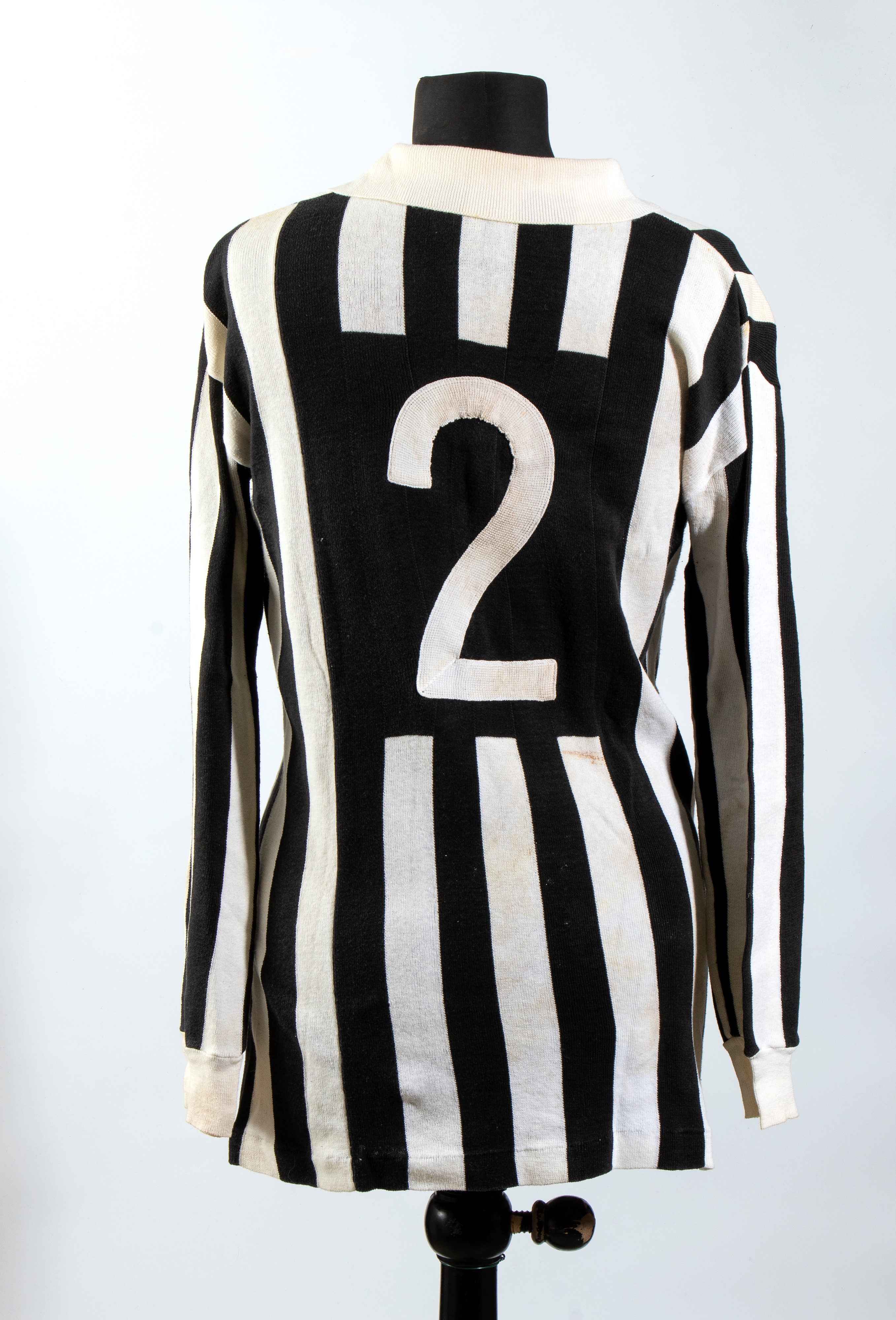 Long-sleeved cotton home jersey (label missing). Black and white jersey with white cuffs and a white collar on a black V-neck, in excellent condition, with minor signs of wear.